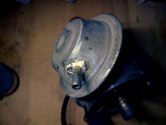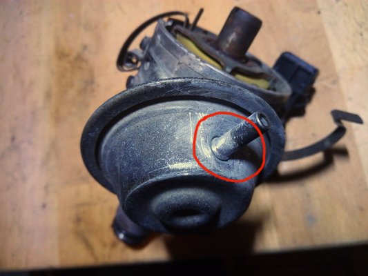 Azért közben is történtek ám dolgok. Például rájöttem a gázadásra torpanás okára, mintegy véletlenül. Amikor ugyanis szedtem kifelé a gyújtáselosztót – ami egyéként hajszálpontosan az a szerkezet, mint egy állólámpás benzinesé, ugyanaz a hajtás, vákuumdob, ház, szerintem még a rotor és a fedél is, csak ebben egy elektronikus pók pörög megszakító és kondi helyett -, észrevettem, hogy lötyög az elosztó oldalára szerelt vákuumdob kis szívócsöcse. Ami ugye, abszurd név, hiszen a csöcs nem szokott szívni, hanem épp fordítva... De lépjünk túl ezen.