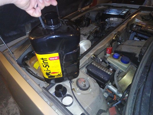 Ez annyira nem egyszerű, mert az olajteknőben van egy hullámzásgátló lemez, amiatt meg mindenféle trükkös forgatásokkal lehet csak felhelyezni pozícióban (nem sokat tett hozzá a buli hangulatához a teknő szélén szépen elkent, majd lassanként a leömlőkön, a kezemen, a futóművön és a keresztstabin megjelenő Teroson-kenőcs). Az sem öröm ilyenkor, hogy az olajteknőt az olasz (vagy éppenséggel Hruska) 345 692 129 csavarral gondolta rögzíteni a blokkhoz,egyik se talál a helyére, mind ragad a kék trutyitól stb.