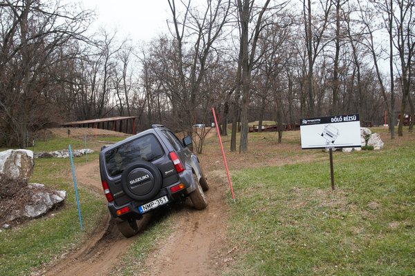 Egy pillanatra nem figyelek oda, és a sárból máris ráfordulunk a rézsűre. Oda, ahol utasként már fejtetőn, de legalább az oldalán pihenő Suzukit vizionáltam. Kormánnyal a kezemben kicsivel jobb a helyzet. Egyesben, alapjáraton lépegetünk előre, majd szépen le is fulladunk. Oktatóm azt mondja, egy dízellel itt nincs probléma, a benzinesnek viszont a jelek szerint szüksége van egy pici gázra. A második körben már jobban megy. A kormánnyal kell egy kicsit gépészkedni, és furcsa, hogy a három és fél méteres autó segge mintha folyton meg akarna előzni, de már kezdem élvezni.
