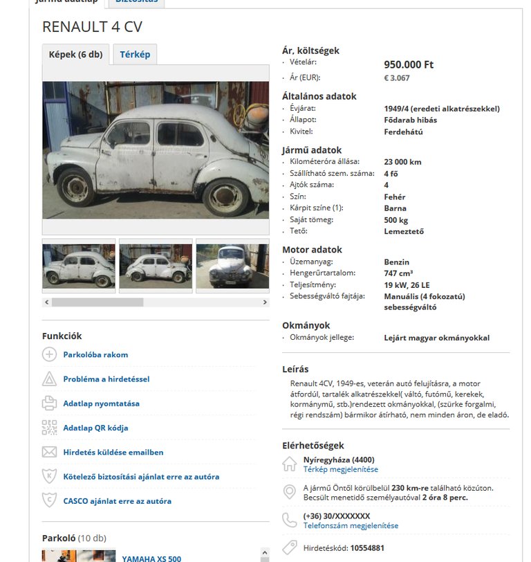 Persze már eltűnt azóta a hahuról a hirdetés, azóta csak egy tíz évvel fiatalabb Dauphine Gordini van fent ugyanennyiért, az már az eggyel újabb modell, szerintem egyébként rosszabb állapotú, azon idegen lámpák vannak, s még csak magyar története sincs. Márpedig ebben a kis 4CV-ben ez volt a legértékesebb.
