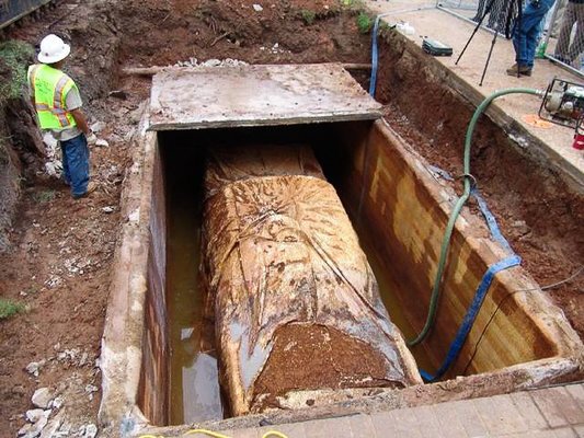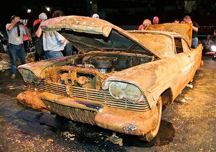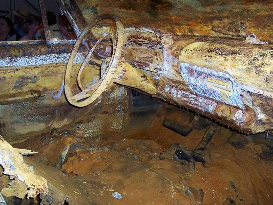 2005 körül már elkezdődtek a kihantolás előkészületei, míg végül 2007. június 14-én feltárult az autó kriptája. A kíváncsi tekintetek előtt rögtön világossá vált, hogy a földbe helyezett betonbunker lehet, hogy bombabiztos volt, de a víznek nem tudott ellenállni. Ugyanez volt igaz az elvileg vízálló burkolatra is, amit az autóra raktak. Volt dolguk a szivattyúknak, mert az autó tetejéig ért a sáros víz, ami keveredett az autóból időközben kifolyt folyadékokkal is, mindez mohón rágta a fémet öt évtizeden át. A pusztítás minden képzeletet felülmúlt, amin a nagyközönség is szörnyülködhetett másnap, június 15-én, mikor is az autó színpadra került. Már az odaszállítás is óvatosságot igényelt, a hátsó laprugókat kirágta a helyükről a rozsda, az autó fara szinte a földet érte, a kasztni alig bírta el saját magát. Nagy meglepetésre némi törölgetés után a lökhárító krómja még mindig büszkén csillogott. A gumik némelyike meg tudta tartani a beléjük pumpált levegőt, és felismerhető volt az egyiken az eltemetéskor ráírt aláírások többsége is. A beltér azonban gyakorlatilag megsemmisült, vele együtt a kesztyűtartóba helyezett tárgyak többsége is. Az indítókulcs úgy, ahogy volt, eltűnt, természetesen az ide helyezett mikrofilmből sem maradt semmi. De többek közt egy rúzs és két fésű felismerhető maradt. A motor egy óriási rozsdás vastömbbé lett. Az autó mögé helyezett fémkapszula tartalma viszont teljesen sértetlenül élte túl az évtizedeket.