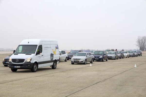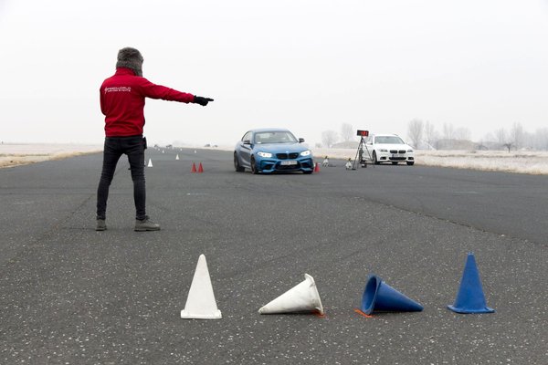 A következő bójasornál a cél az volt, hogy megtanuljunk vészfékezni, és megnézzük, mekkora sebességnél miként alakul a fékút (kis elméleti ismétlés: a pedál érintésétől a megállásig megtett út). Persze ki ne tudna fékezni? - merülhet fel a kérdés. Instruktoraink szerint sokan. Tipikus hiba például, hogy a sofőr nem nyomja elég keményen a féket – így nem vészfékez, csak lassít. Szintén gyakori, hogy a blokkolásgátló visszarugdosásakor megijed, csökkenti a pedálerőt. Sok ráfutásos baleset pedig oda vezethető vissza, hogy még nem áll teljesen az autó, amikor a vezető elengedi a pedált.