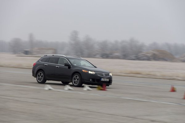 Elsőként a kettős visszasorolás néven emlegetett feladatot kaptuk. A lényeg: a bójákból kirakott pályán először egy sávot váltunk balra, megismételjük ezt még egyszer, majd két sávnyit kell jobbra húzódnunk. Fokozatosan emeltük a tempót: állandó sebesség, nincs közben fékezés, váltogatás, csak kormányzás. Már a beérkezésnél is erős késztetést éreztem arra, hogy lassítsak, teljesen rendellenesnek tűnt ekkora sebességgel végigtolni a jelzések között. Egyre gyorsabban jöttek szembe az akadályok, és egyre kisebbnek tűnt a kormányzáshoz rendelkezésre álló távolság. 85 km/h-nál már csúszáshatáron volt a Suzuki, a gumik megszólaltak, az instruktor pedig mondta is a fülemre: nagyjából itt a vége, ezen a pályán ezzel a kocsival gyorsabban aligha lehet rombolás nélkül áthaladni.
