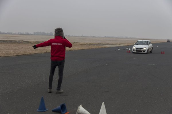 A pályára négy csoportban vezényeltek minket a csípős hidegben – ennek megfelelően váltásban csináltuk végig a négy (plusz egy) feladatot. A menetstabilizátor nélküli Swifttel természetesen az ESP nélküli csoportba kerültem, nekünk kisebb sebességeket határoztak meg mint a segédletekkel gazdagabban megszórt gépeknek.