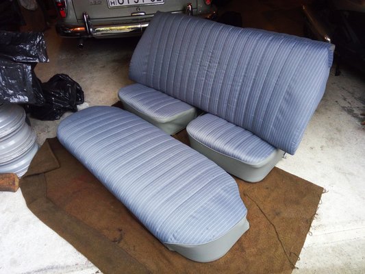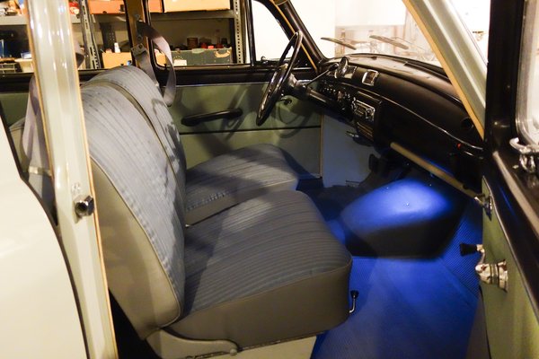 A huzat színe kékes, de ez így helyes, mert hiába tűnik úgy a régi képeken, hogy szürkék voltak az ülések, a támla és az ülőlap találkozásánál találtunk eredeti színmintát, és az kvázi ugyanilyen. Fura lehet, mert az ajtókárpitok zöldes árnyalatúak, de a prospektusokban is ilyen vegyes a belseje a kocsinak, az ülések színét valószínűleg a gumiszőnyegekhez és az első lábtér oldalburkolataihoz igazították, mert azokhoz passzol. István felújította a vázakat és a rugókat is, újratömte a felületeket, körben a műbőr is friss, kvázi új értékű minden.