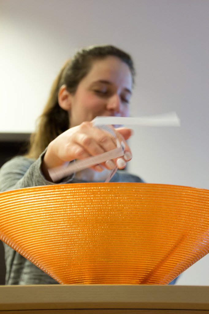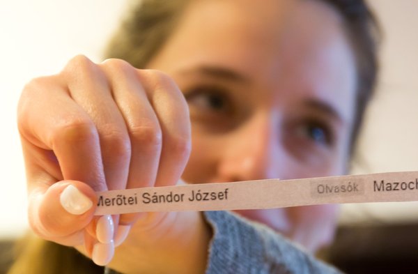 A jelentkezők listáját kinyomtattam, és átballagtam Lilihez, a folyosónk túlsó végén, hogy vállalja a szerencse/balszerencse kezének a szerepét. Vállalta. A sorsolás a felszeletelt névsor cetlijeivel zajlott, a papírcsíkokat szobahőmérsékleten helyeztem a savanyúcukorkás tálba, Lili pedig becsukta a szemét. Íme a technológiát demonstráló kép: