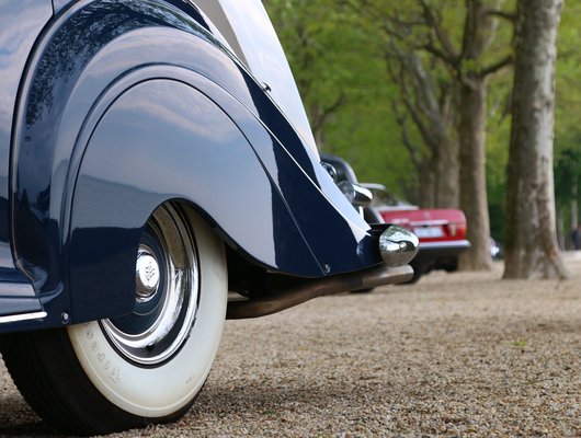 Ugyan a Concours-on nem az 1938-as, hanem az 1954-es változat van kint, de elhihetik, a lényeg nem sokat változott 16 év alatt. Amíg az ember csak képen látja, el sem hiszi, hogy mekkora borzasztó darabot hasít ki a térből egy ilyen autó. A mondás ugye az volt, hogy egy úrnak kalapban is el kell férnie odabent, így aztán a belmagasság vetekszik egy gangos házéval, és persze marhacsordákon ülünk, birkacsordákon pihentetjük a lábunkat.