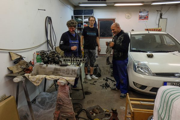 Zsolti autója is a karbisnál landolt, de csak egy gyors ránézésre a tervezett négynapos takarítás, átnézés, állítgatás-szeánsz helyett, hiszen arra már nagyon nem lenne idő. Robi ránézett, és csak a fejét ingatta. Eltömődött üresjárati rendszer, működésképtelen gyorsítórendszer, egy-két napot kéne pucolni, hogy egyáltalán állítható legyen. Ráadásul két karbiról van szó. Szinkronozni csak alapjáraton lehetne, de olyat nem lehet produkálni, precízen gyújtást állítani is két ponton kéne: alapjáraton és fordulaton. Tehát az autó maradt úgy, ahogy van. Végülis: lényegében autópályán és kis utakon megyünk, azt ki kéne bírnia. Tehát mindkét autót nagyjából felkészítettnek vesszük. Én még állítok a váltórudazaton, Zsolti még kuplung munkahengert és két gumit cserél, aztán holnap hajnalban uzsgyi.