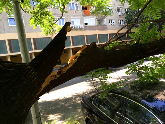 Nem hogy vihar, de tán komolyabb szél se volt. Egyszerűen csak úgy, magától reccsent egyet a nagy ág és BHAMMM. Ezt hallottuk Karottával, mikor még hétfőn az ebédből visszafelé sétáltunk. Kicsit bambán csoszogtunk – nem csak az ebédet, de a korábban szpottolt Tatran látványát is emésztettük. Csak lassan esett le, mit hallottunk. És hogy az a BHAMMM pont úgy hangzott, mint ahogy azt képzeli el az ember, hogy szólhat, amikor egy comb vastagságú ág letörik, és rázuhan egy autó tetejére.