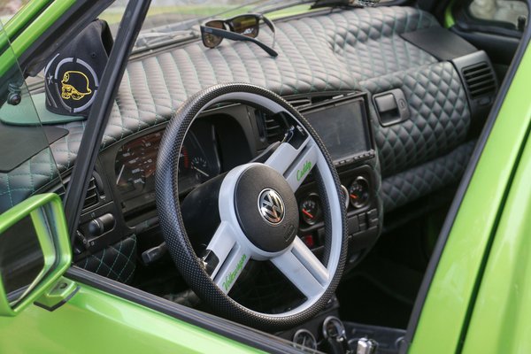Tíz méterrel az olajfoltok mögött persze megcsillant a nap az eddig leírtak tökéletes ellentétén is. Mivel Volkswagen Caddy-t a világnak ezen a felén jó ideje nem szokás már teherszállításra használni, az elvetemült volkswagenesek rég rájöttek, hogy lehet dubsteppé remixelni a korai Golfok klasszikus vonalait. Ennek a zöld Caddy-nek egy hármas Golfból jött a beltere és a motorja is, miközben a tolóablakos hátsó üvegtől a lökhárítókig minden amerikai piacos rajta, egy olyan egyedi orral megspékelve, amilyet még a híres tuner Zender sem mert így megcsinálni. Természetesen a kerékívek is ki vannak szélesítve, hogy beférjenek a légrugókhoz kötött öblös kerekek, a speciális festést pedig a műfüvesített plató teszi igazán feltűnővé. Meg talán a krómozott kályhacső.
