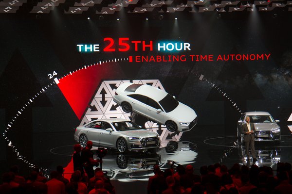 ....utána meg prof. Rupert Stadler (foglalkozása Audi-elnök) meséli el, hogy mennyire az utolsó utáni órában tartunk az autonóm járművek engedélyezésében, Németországban két héttel ezelőtt engedélyezték egyáltalán, és ezzel Európában legalább lesz egy hely, ahol tutira kihasználható a Level 3 önvezető funkciók, meghirdeti az Audi.Vorsprung.2025 programot, ami lényegében 2025-re ígéri a teljes (Level 5) önvezetést – ez amúgy teljesen egybe cseng a Continental beszállító által nemrégiben tartott techshow-n hallottakkal. Csak nem összebeszéltek a németek? Mindegy, a lényeg, hogy folyamatos legyen a Vorsprung. Aztán vége, lehet megnézni az autókat. Azt, hogy az A8-ast lóbáló robotkar hová tűnt, azóta sem tudjuk, ahogy azt sem, hogyan került a színpadra.