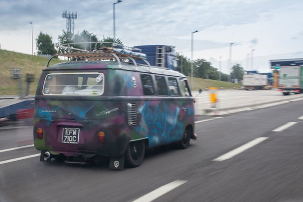 Folkstone-ban botlottunk az első léghűtséses fecskébe, és az aszfaltot karcolgató T1 látványa egyértelművé tette, hogy tetszeni fog az EBI. A vonaton aztán nekiestünk a busz kirakodásának, elvégre közel tetőig volt pakolva alkatrészekkel és felnikkel, de még az eredeti tető kivágott darabja is ott figyelt. Az első és legfontosabb az ablaktörlő volt, de némi próbálkozás után egyértelmű volt, hogy a csonkok annyira berozsdásodtak, hogy nem tartották meg rendesen a lapátokat. Az autópályán meg talán annyira nem lett volna előnyös, ha egy közlekedőtárs kapna két patinás lapátot a meglévők mellé. Összenéztünk, megállapodtunk, hogy az eső márpedig nem fog esni, hisz nincs ablaktörlőnk. Calais egyik benzinkútján azért Bushi némi vw-belterjes viccelődés után szerzett valami víztaszító kencét egy fehér T1-es tulajától.