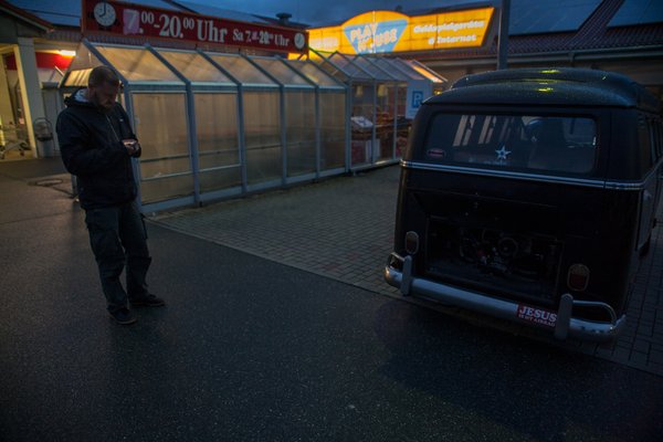 Megálltunk egy gyors hamburgerre, hogy közben felváltva győzködjük egymást tovább, menni fog ez hazáig. Egyre csak teltek a percek, de csak nem akartunk felállni, hisz a kajáldában meleg volt. Ennek júliusban lehetne sportértéke, de kint 15 fok volt, esett az eső, Ragnarban az állófűtés beömlőjét eltemették a dobozok, mi meg még mindig a belga esővizet éreztük a cipőnkben. Ha nehezen is, de összeszedtük magunkat, én beültem a kormány mögé, hogy aztán húsz méter múlva, egy szupermarket parkolójában újra kiszálljak, mert valami elkezdett hangosan kolompolni hátul. Meglazult az ékszíj, az csapkodott. Bushi a biztonság kedvéért telefonos segítséget akart kérni, de hamar letett róla. Egyszerűen nem lett volna értelme. Megszerelni nem tudtuk volna, hisz semmilyen szerszám nem volt nálunk.