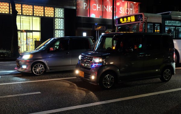 Akkoriban, harmincöt évvel ezelőtt a legáltalánosabb autók az utcán a normál, szedán formájú, Toyota Carina- és Crown-, illetve Nissan Laurel- és Cedric-méretű és jellegű autók voltak. Ma már alig-alig látni autóformájú autót, ott lefingottnak tartott (bár még csak tíz év körüli, csillogó-villogó) modern Laurelek, Mark II-k előbukkannak nagy ritkán a tömegből, de a kocsik többsége buszlimuzin (egyterű, MPV, nevezd, aminek akarod). És kei-autó. Sokkal több kei-autó, mint régen, hiába nőtt ijesztő óriássá a gazdaság.