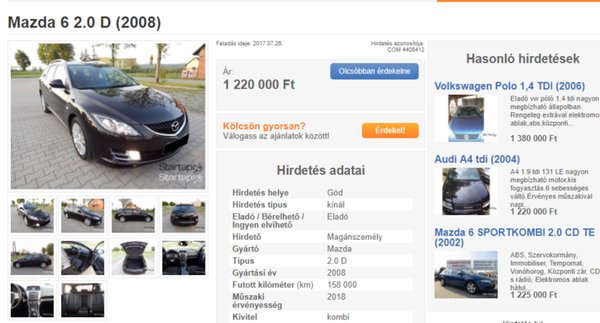 Mindezekkel azok sem feltétlenül vannak tisztában, akikre ma egy ismeretlen illető várakozott a magyar Startapró.hu nevű ingyenes apróhirdetési oldalon. Egy olvasónk itt botlott bele ennek a képeken szép, 2008-as Mazda 6 Sportkombinak a hirdetésébe. A kétliteres, kézi váltós dízelben kevesebb mint 160 ezer kilométer van, ami tulajdonképpen hihető. A történet folytatása viszont nem az, viszont legalább tanulságos.