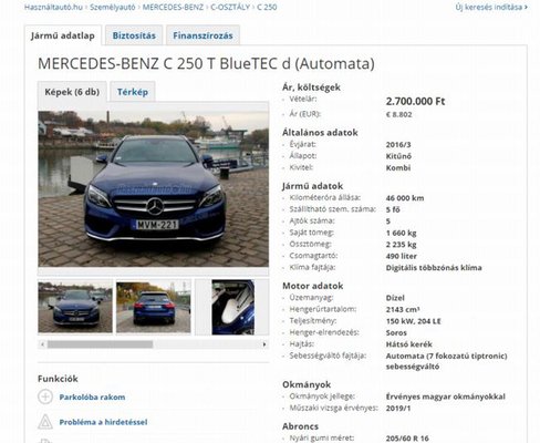 A jelek szerint nálunk is divatba jött az apróhirdetési csalás kicsiben és nagyban egyaránt. A lopott képekkel doldgozó illető ma egy tavaly tavasszal gyártott, kék Mercedes C 250 T BlueTec-et hirdetett. A képeken ott volt a rendszám, azokat az Autoblog nevű magyar autós oldal tesztjéből lopták. Mi nem ismételjük ezt meg, így ezúttal csak a saját, majd kollégátol kapott mobillal, később vezetékessel, illetve egy búgó hangú kolléganő felkérésével kivitelezett telefonos próbálkozásaim után nem sokkal törölt hirdetés screenshotját hagyom itt, e szép nap örök mementójaként.