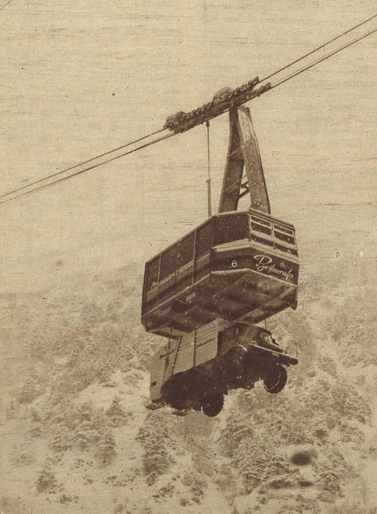 Az újság az írja, hogy emelőkkel segítik a speciális felépítményű Unimogot a kabin aljára, ahová drótkötelek segítségével rögzítik. Szélsőséges időjárási körülmények között mit csinálnak a szeméttel a hegyen élők? Honnan tudják, hogy milyen nehéz a megtömött kukásautó? Nyilván kiszámolták a mérnökök és bíznak a svájci drótkötélben, de ez mutatvány elég meredek megoldásnak tűnik. Nem jár arrafelé valaki, aki megnézné, hogy még mindig Unimog kullancs van-e a lanovkán?