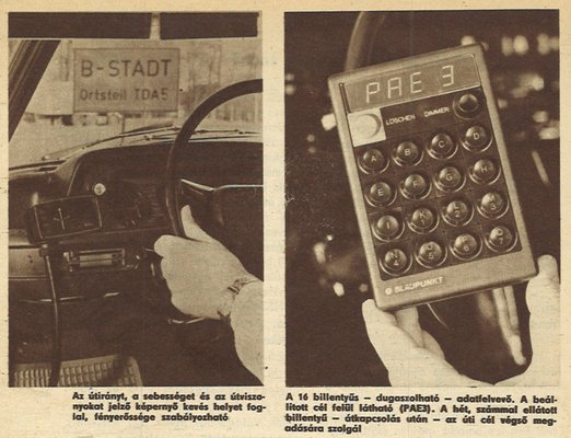 Ha az NSZK-beli Blaupunkt gépkocsi-irányító rendszere beválik, az autósok a jövőben mind a vidéki, mind a városi utakon térkép nélkül is jól eligazodhatnak. Mindössze négy billentyűt kell lenyomniuk indulás előtt megadva a berendezésnek úti cél kódját, ezt követően minden információt automatikusan megkapnak. A vezető képernyőről kap tájékoztatást a követendő útvonalról, a pillanatnyi közlekedési viszonyokról, a mindenkori érvényes sebesség-előírásokról, stb. (...)