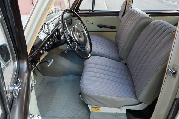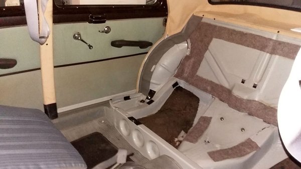 Közben megjött a belső garnitúra, István még készített nekem egy kis beszegett szőnyeget a két első ülés közé, mert az vagy sosem volt az autóban, vagy elveszett a felújítás közben, már nem emlékszem. Ezzel most tényleg komplett lett a belső, baromi szép. És nem véletlen az ülés és az ajtókárpit színeltérése: ez az üléshuzat az a szín, ami a kocsi eredeti üléseinek a támla-lap közötti részén látható volt, s a neten is tucatjával van gyönyörűre megcsinált, esetleg megmaradt szövetüléses Ponton ilyen színeltéréssel – úgy tűnik, hatvan éve nem tartották kötelezőnek, hogy a kettő passzoljon egymáshoz.