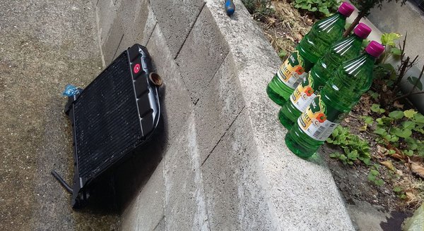 Ha már szétszedtem a vízkört, egy másik aggályomnak is a végére jártam: a hűtőt feltöltöttem ecettel, és egy héten át mindennap kétszer alaposan átlögyböltem, kiöntöttem, leszűrtem és a (mechanikailag) tiszta ecetet visszatöltöttem. Miután az új, már közdarabosított vízpumpával összeraktam a rendszert, és az autót kipróbáltam (még ülések nélkül) a garázsban, megéltem a csodát – már alapjáraton sem melegszik a rendszer, amit eddig öt-tíz perc járás után mindig csinált. Azt hiszem, egy újabb hibát megoldottam.