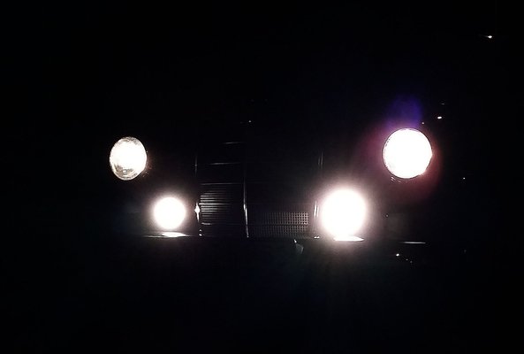 Elpakolás előtt még készítettem Dezsővel azt a képet, amit eddig mindig elfelejtettem: világító, csöcsös Marchal-ködlámpás, éjszakai fotót – sajnos csak telefonnal.