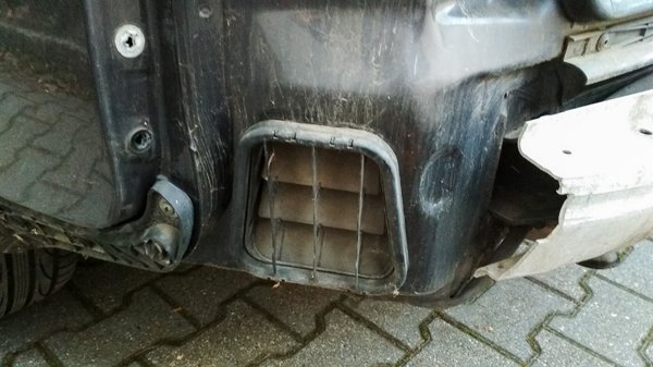 Aztán beszereltem az Audiba. A lökhárítót nem nagy cucc lekapni, tekintve, hogy pontosan ugyanúgy szerelték vissza a helyére az elődeim, mint bármi mást ezen az autón: fele annyi csavarral, mint eredetileg. Az látszott, hogy a hátulját kicsit megnyomták, de ami előkerült, meglepett: a jobb oldali szellőzőnyílás lényegében megsemmisült, annyira meggyűrték a lemezt. Itt némi plasztikázást végeztem fekete duct tape-pel. Mellesleg a fém lökhárító jobb vége is elhajlott, de nem vészesen. Eredetileg azt hittem, valami pici parkolási puff nyomai látszanak a lökhárítón, de annál azért nagyobb ütés volt.