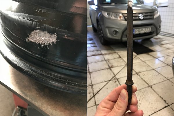 Amíg a szerkesztőség nagy része az óbudai iroda melegében gyártja a tartalmat, van aki odakint tolja az autótesztet. Tocitól jött egy mail az imént egy csokor képpel: Ha a hóesés nem lett volna elég, a Pilisben defektet kaptam a Suzuki Vitara tesztautóval. Egyszer csak arra lettem figyelmes, hogy valami kattog az autón. Ilyet még nem láttam, egy véső szúrta át a gumit, és ütött kisebb lukat a felnibe. Egy pomázi gumisnál küzdünk a továbbhaladásért. Vigyázzatok magatokra, meg a vésőitekre!