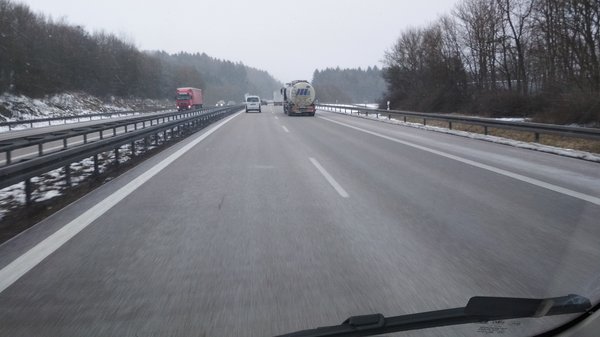 Az úton tényleg minden rendben volt, az idő kifejezetten király - írnám, de közben, míg idáig eljutottan a szövegben, az egész jó időnek vége lett, esik a hó, az út latyakos, otthon ez már "ítéletidőnek" minősülne, de persze nem az, csak simán szar. És még szarabb lesz lepucolni a Pontont, aminek egyébként 130-nál már el-elemelkedik az üvegről az ablaktörlője. Sokan kérdezik, hogy miért nem csomagoltuk be - egyszerűen azért, mert ahogy a menetszél cibálja, az aláment dzsuva összekarcolná.