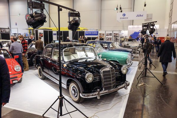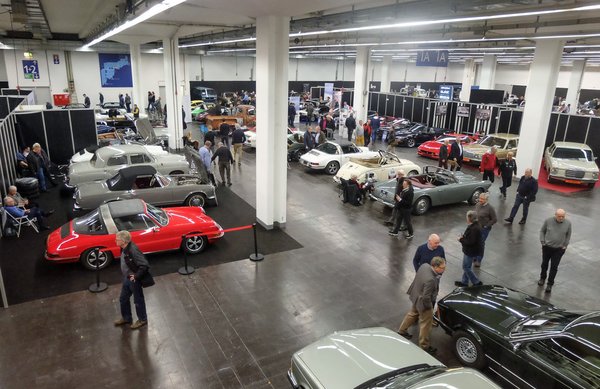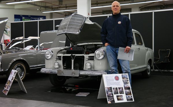 Épp az 1A csarnokban, itt a börze távoli, kicsit eldugott, pince jellegű részén – hogy áldom az eszem, hogy kiadtam a 100 euró+MWSt-t arra, hogy bent legyek, mert kint, a három szabadtéri placcon, az ónos szitálásban, a mínusz két fokban alig van nézelődő, azok is inkább katasztrófa-turistáskodnak, miközben a gazdik a rommá lehelt kabinokban lilára fagynak az eladás legcsekélyebb reménye nélkül – is van egy másik Ponton, amúgy meg a felhozatal szenzációs. Dugig vagyunk Porschékkel, súlyos a Mercedes-kontingens, tömegével hevernek szanaszéjjel a hatalmas, 50-60 éves amerikai vasak, köztük Simca-Abarthok, 23 ablakos Sambák, Alfa Romeók és ami csak létezik – olyan jó 200-250 autó lehet csak itt.