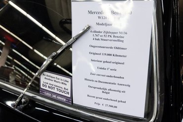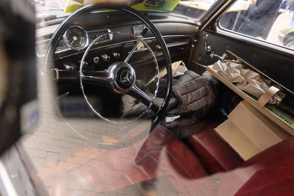 Hosszas keresés után megtalálom a másik kocsit a 3-as pavilonban egy olyan standon, ahol csupa megmaradt, kicsit használtas-horpadtas, eredeti autót árulnak. Ez a kocsi egy 190-es (dönthető ülések, díszlécek az ablakok alatt), de kicsit újabb, és kapaszkodjatok meg – 9177 kilométert írnak rá. És eredeti fényezést. Meg eredeti krómokat, amik amúgy kicsit mállanak. És látok néhány randa horpadást a karosszérián – miért mindig a bal hátsó sárvédője megy szét ezeknek a Pontonoknak? Na meg hiányzik a két hátsó dísztárcsa is.