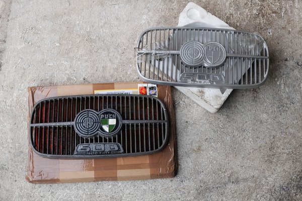 Kábelkötegem még nincs, biztosítéktáblám viszont már van, a tankot is előtúrtam, amin rajta van a korai Puchok érdekessége, a benzincsap. Mondjuk, utóbbinak elég ramaty az állapota, nem hinném, hogy csere nélkül megússza. Biztosan valami korabeli osztrák vagy német motoré jó lesz rá. Még jó, hogy orr-emblémából akad kettő: egy eléggé nagyjábóli mintának való, utánöntött példányt, amit Tóth Gabitól kaptam, Gál Peti (tűzoltó, kommentelőnk) megcsinált szépre, csak le kell festeni. Ha pedig az valamiért nem stimmel, hát vásároltam is egy homokfúvandó, viharvert darabot is, amin meg hátulról rajta a tyúkrács. Valami lesz ezekből, fogpiszkáló, ha el nem baszom.