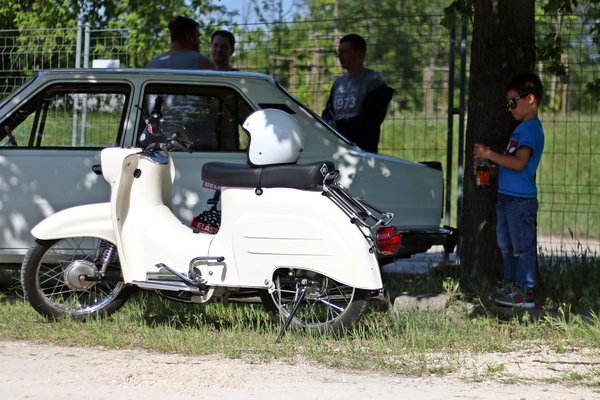 A jó időnek hála nagyon sok motoros jött el, sőt volt aki azzal járta be az egész parkolót. A kedvenc képem, amikor a Simson Schwalbe egyesbe lassan pöfög végig az autók között, és a kormány mögül kitekint egy kapaszkodó kisfiú. Vespát szinte minden korosztályból lehetett találni, de a kedvencem a kék-fehér Puch DS50 volt, ami már felülről súrolhatta az ötvenet - mármint korban. A masszív cruiserek békésen álltak a buta tekintetű MZ Trophyval és a muzeális Simsonokkal, de közvetlen mellettük a legós pultot is sokan letámadták.