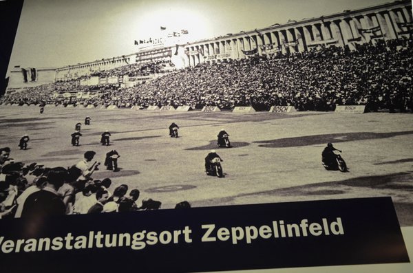 Fura érzés a Nagy Út gránitlapjain próbálni díszlépni, a Kongresszus még félkészen is nyomasztóan nagy, hát még milyen nyomasztó a múzeum benne, de első sorban nem ezekért hagytam hátra a játékvásárt. A Kongresszustól újabb húszperces sétára áll a Zeppelin-mező, annak végén a Zeppelin-tribün. Meg kell kerülni hozzá egy nagy tavat, a legnagyobbat a Dutzendteich-en, de olyan előéletért, ami ott vár, megéri a séta. Itt már egy versenypályára megyek – bár ha követjük az időrendet, még le kell mennie a második világháborúnak, hogy itt bármi motoros jármű gurulgasson tankokon és Hitler Mercedesén kívül.