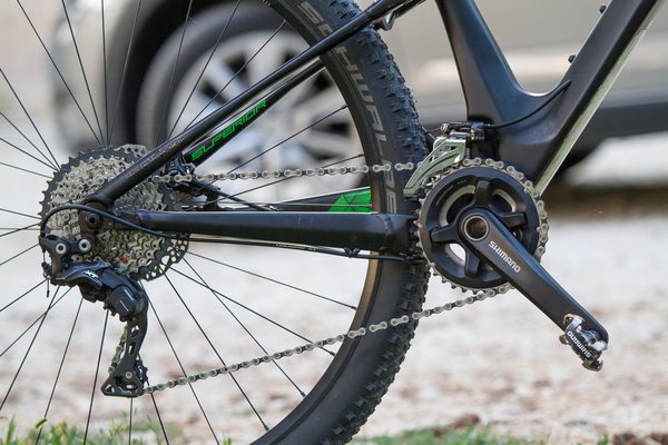 Ez egy 2x10-es hajtás, vagyis a hajtóművön kettő, a hátsó agyon tíz lánckerékkel variálhatunk. Ennyi pénzért viszont már tényleg illene egy nem szérián kívüli, hanem mondjuk Shimano XT hajtóművet beépíteni. A váltás minőségével alapvetően nem volt gond, a legrövidebb áttételen csak a tapadás és a fáradás jelenthet akadályt a mászásnak. A fékek viszont már Shimano XT-k, amelyek ár/érték arányukat nézve talán a legjobbak, ennél lényegesen komolyabb, lejtőzésre szabott bringákra is szerelik. Amíg nem terheltem meg durván az egyik kedvenc lejtőmön, nem is volt baj, viszont ha az ember lefele is akar haladni, akkor érdemes a gyári gyantás betétet fémesre cserélni, vagy egy nagyobb féktárcsát feldobni, de aki tutira megy, inkább mindkettőt. Olyan ez, mint az autóknál, a fék sosem lehet elég jó.