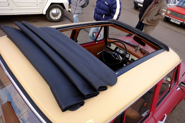 Volt azonban, aki Twingo-skalpolás nélkül, eredeti anyagból oldotta meg az ügyet. Egy Trabanthoz közeledve ugyanis feltűnt, hogy dupla fedele van. Az utastérbe benézve aztán megláttam az okát - a kocsi eredeti tetejét középen kivágták, egy másik kocsi tetejéből egy kicsit nagyobb kivágott darabot ráhelyeztek, s az egészet négy, nagy, kézi tekerő szorította oda az alsó részhez. És tényleg, itt nem volt csalás, minden Trabantból készült: ugyanaz az ív, ugyanaz a szín, ugyanaz a Duroplast.