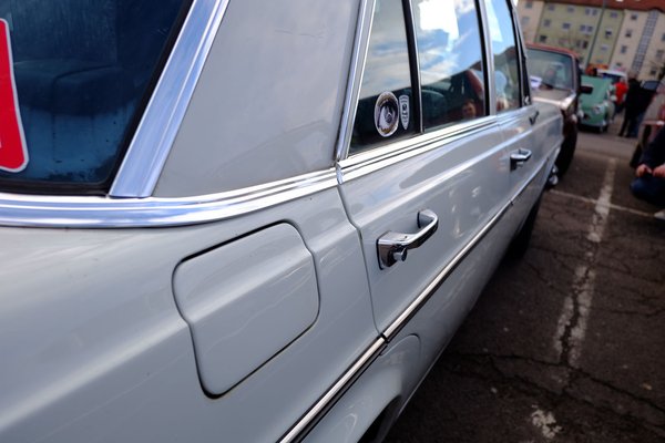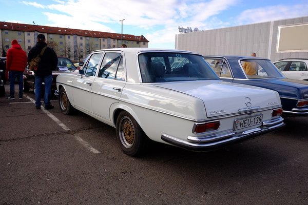 Rövid kört röppentünk az ismerősök között, s meglett a megoldás: a hetvenes évek eleji W108-as alatt a kettővel későbbi S, a W126-ös mechanikája van, ferde háromszög hátsó lengőkarokkal, alu-elemekkel és a többi. Még a szellőzés középkonzolja is onnan származik. Az autó állítólag jelentős használatban van, külföldre járnak vele, vagány cucc. Csak a hátsó kerékjárati ív (ami a 108-ason eredetileg elegáns, elnyújtott, ezen viszont egyszerű, kerek) és a küszöbdíszléc hiánya zavar rajta - persze aztán átmehetünk Nessyhez a tulajjal, mert azon is akad bőven kötözködni való, nem tagadom.