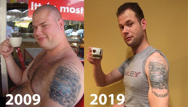Amikor meglátják a 10 évvel ezelőtti képemet, akkor a tetoválás után jellemzően a második az, hogy rákérdeznek valamilyen módon arra, hogy miként fogytam így le. Nem nehéz észrevenni a különbséget, de a pontosság kedvéért leírom, hogy 123 kiló környékén voltam, amikor az ominózus csészés kép kikerült valahogy a netre. Nem tudom máig, hogy történt a dolog. A fénykép egy családi nyaraláson készült és én biztosan nem raktam ki sehová. Ma 79-80 kiló környékén mozgok és ezt már lassan négy éve tartom is.