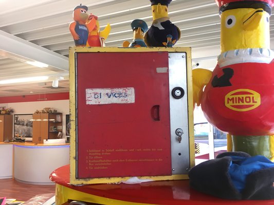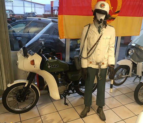 Még visszamentünk a kereskedésbe pár apróságért, de már nagyon rajtunk volt a mehetnék. Csak hogy most, hogy már elintéztünk mindent, és mindenki megkönnyebbült, rendesen körbenéztünk a bemutatótérben. Ó, anyám, mik vannak itt! Nagyon komoly Ostalgie-gyűjtemény, azaz keletnémet-nosztalgiázós tárlatot nézhet meg bárki, aki nepperünkhöz betér. (Ostalgie: az Ost, mint kelet és a Nostalgie, mint nosztalgia szavak összevonásával született a szó) Az azonnali indulásnak persze lőttek, hát ki tud félbehagyni egy olyan tárlatvezetést, ami egy endékás rendőr ETZ 250-essel kezdődik, a keletnémetek egyik első tévékészülékével folytatódik, és még azt is megtudtuk, hogyan tankolhattál a DDR-ben éjjel, annak ellenére, hogy a kutakat bezárták este?