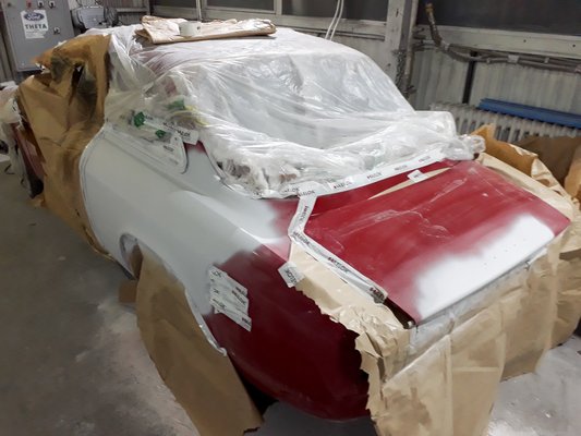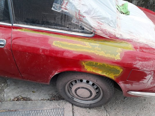 Akadt vele szenvedés. A negyed százada felvitt piros festéket mindenhol leszedték, ahol a legkevésbé is gyanús volt. Kicsiszolás, rozsdamarás, szárítás, rozsdamarás, kittfelhordás, szikkasztás, felhordás, csiszolás, szikkasztás... a végtelenségig hordták fel a finom rétegeket, hogy szépen és a lehetőségekhez képest tartósan épüljön fel a fényezés. Nem két perc az ilyen, pláne ha az ember azt szeretné, hogy minden réteg rendesen kiszáradjon, pláne pedig a B, illetve C vágányon autózva. Egy csomó ismerősöm már helyettem emelte fel fejben a szavát, mondva, ennyi ideig nem tarthat. De talán elfelejtették, hogy ez itt most nem valami új, felesleges rétegeket még nem tartalmazó autó fényezése, hanem egy lakatolgatott, itt-ott faragott, öreg verdáé. Bár olykor én is türelmetlenkedtem a bajszom alatt, azt mondom: csoda, hogy elkészült január végére. Mert elkészült.