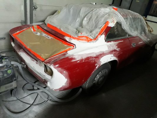 Sajnos, mint ahogy én is tudtam, elég vastag az Alfán a kittréteg. Kitt vagy gitt - én kittnek hívom, mert az a szakszerű, ugyanis ez a kétkomponenses cucc hivatalosan "autókitt", de azok, akik az ötven évvel ezelőtti szakik szóhasználatát örökölték - amikor még más anyagokat használtak - gittnek mondják. Kompromisszumos javaslatom, hogy mindenki elégedett legyen és ne alakuljon ki egy apró véleménykülönbségből parttalan vita: a szövegben hol kittet, hol gittet írok, az úgy oké? Vissza az autóhoz: naja, 1993-ban, amikor utoljára kihegesztették ezt az autót, még filléres tétel volt, senkinek eszébe nem jutott volna milliós restaurálásnak alávetni, csoda, hogy ki nem dobták. Én speciel örülök, hogy legalább annyira vonalban van és formás, amennyire, de Tomi papája, akit mellesleg szintén Tamásnak hívnak, nagyon győzködött, hogy az egész autót vissza kéne pucolni fémig, onnan újrafényezni, talán még karosszériázási hibákat is kijavítani rajta, mert így ma már nem illik, nem jó.