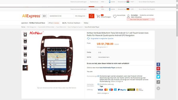 Megvettük a kiszemelt Maserati Quattroportét a 2000-es évek elejéről, de zavar benne az elavult középkonzol. Régi a GPS, nincs is már hozzá frissítés, és a telefonunkat se tudjuk rákapcsolni, hogy zenét hallgathassunk. Az előző bekezdésekből már biztos mindenki rájött, hogy hol rejtőzik a megoldás. Az Aliexpressen – ha van fölösleges 1768 dollárunk, azaz kb. félmillió forintunk – vehetünk modernizált középkonzolt. A leírás szerint ezzel Teslai magaslatokba emelhetjük a 15 éves Maseratink fedélzeti számítógépét.