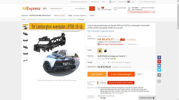 Amikor szembejött az Aliexpressen a Lamborghini-diffúzor, a következő kisfilm játszódott le a fejemben: egy fiatal budai milliomos leugrott kenyérért a Lamborghini Aventadorjával kedvenc kisboltjába, de a padkával véletlen leverte a diffúzort. Nem esett pánikba, amíg a kisboltban szeletelték a kenyerét, telefonját előkapva megrendelte az új diffúzort. Még a héten megérkezett, beparkolta az Aventadort akna fölé, és a haverokkal sörözve egy délután alatt átcsavarozták.