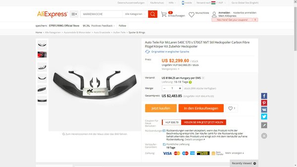 Megkerestem nagyobb márkák légterelőit erre a McLarenre, csak az összehasonlítás miatt. Nagyjából egymillió forinttól indulnak, szóval az Aliexpress 650 ezer forintos szárnya vagy nagyon megéri, vagy csak szimplán gagyi.