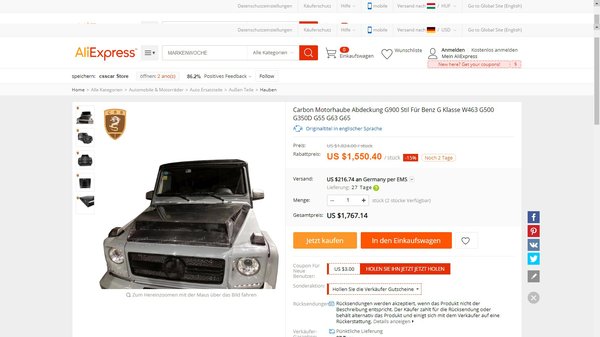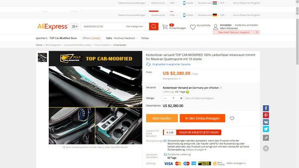 De akkor tegyük fel, hogy pörög a vállalkozásunk, és lecserélhetjük az öreg olasz luxusautónkat egy újra. Elégedettek voltunk, úgyhogy amellett, hogy maradt a Quattroporte, ugyanúgy az Aliexpressről fogjuk személyre szabni. Az a baj, hogy ezeknek az autóknak ronda fabetéttel van kirakva a beltere, amit jelképes 2380 dollárért (670000 forintért), kicserélhetünk szénszálas lakkozott beltéri elemekre – mert azok olyan szépek.