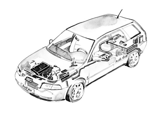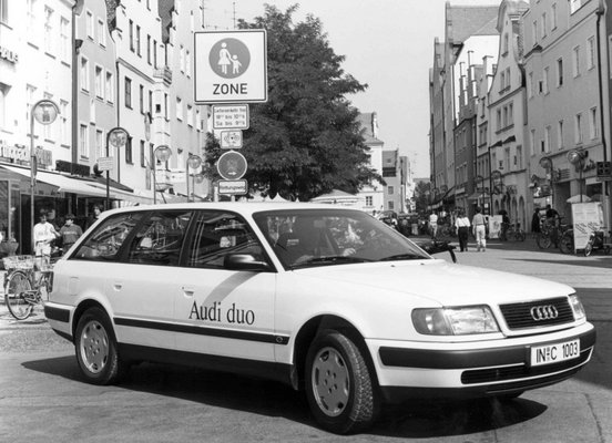Az Audinál ugyanis nem adták fel, két év múlva újrapróbálkoztak, méghozzá egy újabb, C4-es 100-assal. Még ennél is benzines hibridben gondolkodtak, amelynek alapját egy kétliteres négyhengeres adta. A kombi kaszni nem volt véletlen, az akkucsomagot a csomagtartó fogadta be. Itt már állandó Quattro összkerékhajtást alkalmaztak. Az első, tíz példányt megélt Duo után ebből sem lett igazi áttörés.