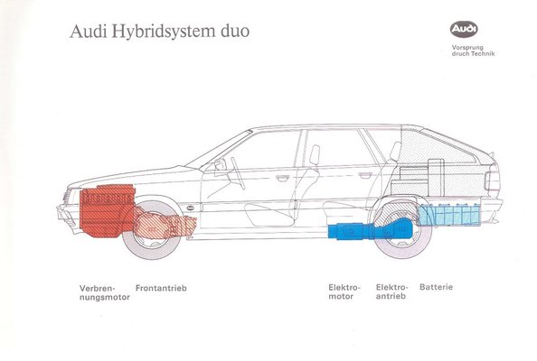 A sztori éppen harminc évvel ezelőtt kezdődött, akkor mutatták be ugyanis a németek az első Audi Duót – igen, a Duo a rendszer kettősségére utal. Igaz, ez még egyáltalán nem dízel volt. Fogtak egy C3-as - Szivar - 100-as Avantot (kombit), elsőkerékhajtással, és 2,3 literes, sorötös benzinmotorral. A hátsó tengely pedig kapott egy 9,3 kilowattos, azaz 13 lóerős villanymotort. Utóbbi kis sebességnél működött, állóhelyzetben, gombnyomással lehetett aktiválni.