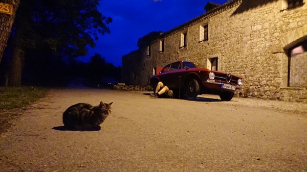 Szóval tök sötétben megérkeztünk a szálláshoz egy aggasztóan köhögő veteránnal. Csikós befeküdt az Alfa alá, amíg én az érdeklődve odagyűlt macskákkal kokettáltam. A vendéglátónkat telefonon tudtuk csak elérni, teljesen kihalt volt az épület. Meg is érkezett nem sokkal később, és közös nyelv híján elmutogatta a tudnivalókat, majd otthagyott a romantikus bed and breakfastben.