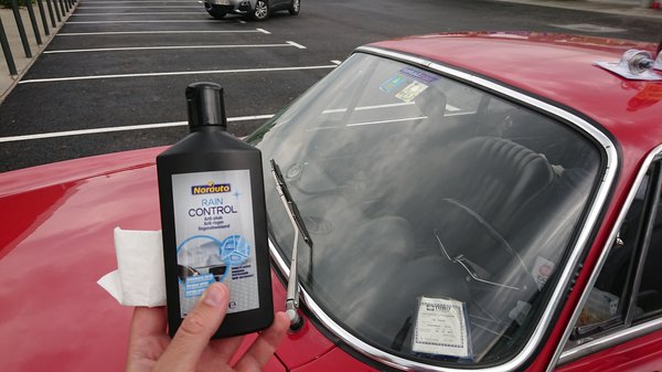 Tekintve, hogy az út háromnegyedére vegyesen vihart vagy sima esőt jelzett az internet, és nekünk csak egy darab, ablaktörlésre korlátozottan alkalmas lapátunk van, megpróbáltuk kontrollálni az esőt egy csodaszerrel. Egy kis kenegetés után egész jól be is vált a Rain Control, de sajnos a megfelelő alapozáshoz nélkülözhetetlen ablakmosó folyadék csak akkor került elő, amikor már a vezető oldalra néhány tucat bogár tetemével keverve egyenletesen felvittem a víztaszító réteget.