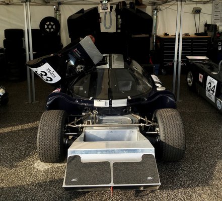 Ugyanazon a soron, ahol a 917 parkolt, a sátor alatt röfögtettek egy 1969-es Lola T70 Mk III B-t is. Meg kell hagyni, az is csinos versenyautó, a V8-as úgy ordít, hogy attól szó szerint megfájdul az ember dobhártyája. A kipufogó végei mögé nyílik a gépháztető – a kiömlő égéstermékek minden gázfröccsre le akarták törni a zsanérokról az egész miskulanciát. Az orra épp nem volt rajta, látszott a szegecselt, alumínium monocoque váz, a filigrán csövekből álló futómű, és persze minden négyzetmillimétere patika tisztaságú, tökéletes volt. De nem ezek miatt esett le az állam.