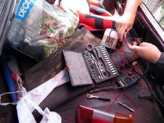 Este kicsit turkáltam a vezetékek között, találtam némi katyvaszt, mert egy drót leszakadt, egy másik pedig csak úgy be volt csúsztatva az amúgy katonai szabványú Mercedes-csatlakozók alá, miközben a testelés sem volt acélos. Ehh, ezt is szét kellett volna szednem az út előtt. Mindenesetre a sok matatásra nemhogy a két féklámpa nem jött vissza, hanem a bal oldal teljesen lehalt, a jobb oldalról meg eltűnt a helyzetjelző is. Ott álltam egy teljesen szétszedett csatival, hátsó lámpák, kapcsolási rajz és csatlakozó-lábkiosztási diagram és forrasztópáka nélkül. Ja, nem, maradt egy jobb tolatólámpám és egy jobb indexem. Hurrá. És volt kéznél egy multiméterem, ami meg hülyeségeket mutatott, ahogy Bálint elöl nyomkodta és tekergette a szerveket az autóban. Persze levett plusszal a gyújtótrafóról, mert az ugye, beszarik, ha tíz perceket rajta van az áram, gyújtás nélkül viszont a Mercin se index, se féklámpa, se tolatólámpa.